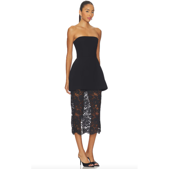 The Jada Midi is a striking strapless black dress that combines timeless elegance with modern allure. Its sheer lace skirt adds a delicate, feminine touch while the midi length offers a sophisticated silhouette.