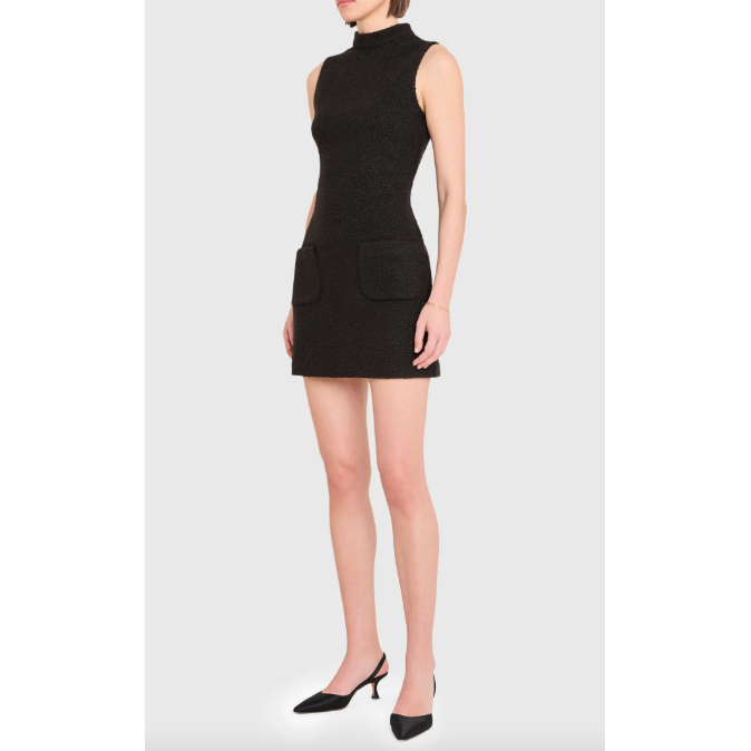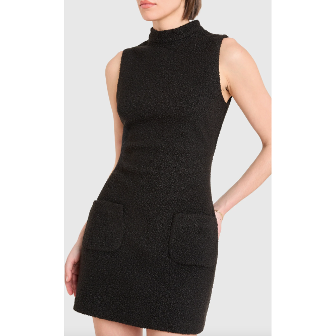Elevate your style with the Como Mini, a chic mini dress crafted from classic black tweed. Featuring a sophisticated high neckline and convenient front pockets, this piece combines timeless elegance with practical design. Perfect for making a striking impression at any event or outing.