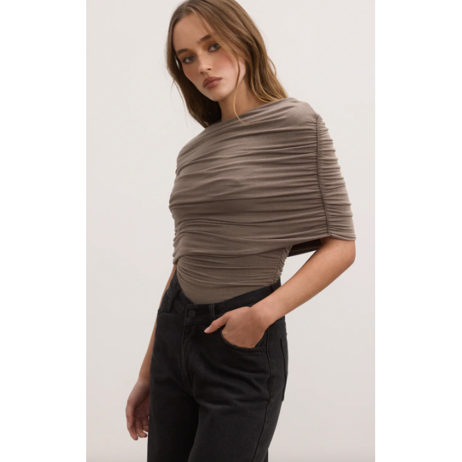 The Daisy Bodysuit features a chic high neckline and playful all-over ruching. With long sleeves and a cozy mink shade, it’s perfect for adding a fun, stylish touch to any outfit.