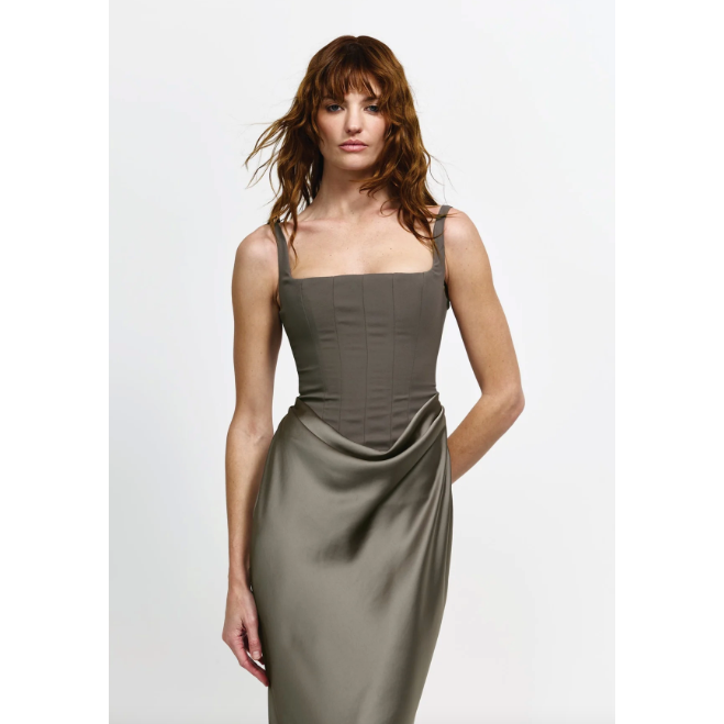 The Keanna Gown features a playful square neckline, a structured bodice, and a flowing satin skirt in soft sage—perfect for adding a fresh twist to any event.