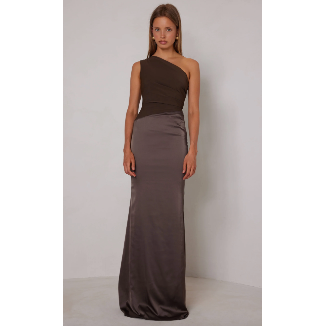 Make a bold entrance in the Shay Dress. This one-shoulder maxi features a captivating two-tone espresso design that exudes sophistication and modern elegance. Perfect for any special occasion where you want to stand out.