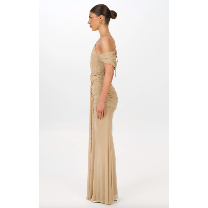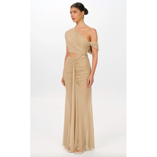 Elevate your style with the Zimi Maxi, a sophisticated one-shoulder dress in a delicate beige shade. Featuring elegant ruching and a sheer mesh skirt, it offers a flattering silhouette with a modern edge. The side cutout detail adds subtle allure, making this maxi dress perfect for refined evening occasions.