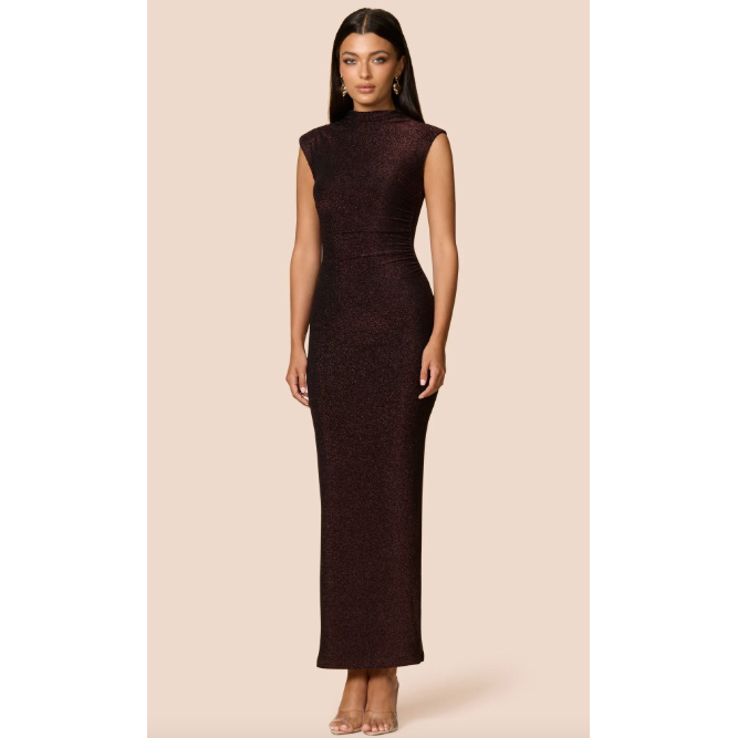 Elevate your style with the Bianca Midi, featuring a sophisticated high neckline and a luxurious shimmery fabric that catches the light beautifully. This elegant midi dress in rich brown offers a timeless silhouette perfect for any occasion where you want to shine with subtle glamour. Embrace effortless elegance and make a memorable statement wherever you go.