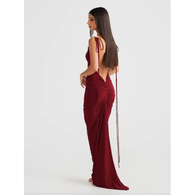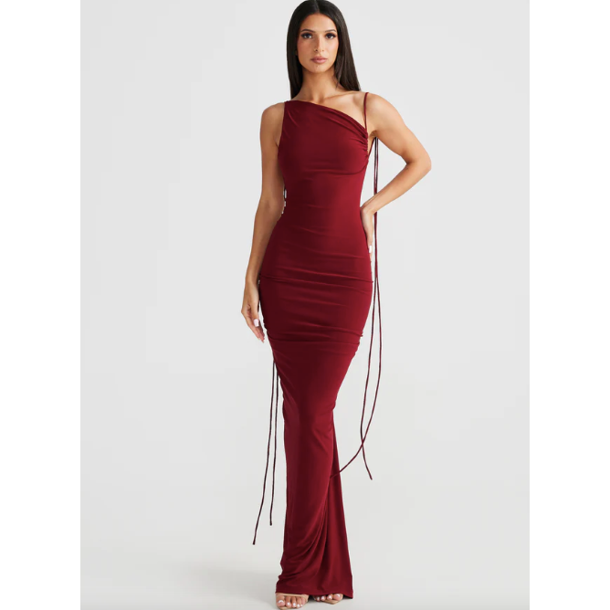 The Gia Dress showcases a sophisticated asymmetrical neckline and an elegant open back, enhanced with delicate self-tie strings for a refined finish. Available in classic black and rich wine hues, making it an exquisite choice for formal occasions and stylish evenings.