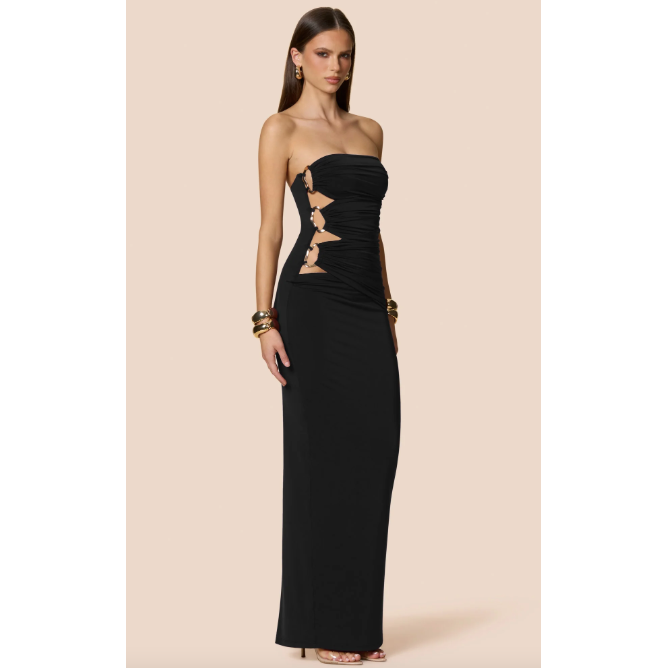 Turn heads effortlessly in the Portia Bandeau Maxi. This strapless black gown features a sleek back slit and eye-catching gold hardware detail—perfect for making a bold, unforgettable statement.