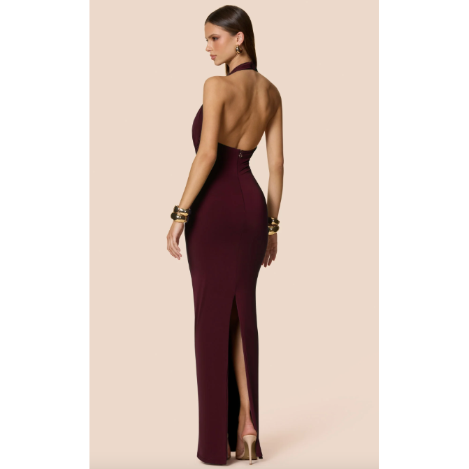 The Portia Halter Maxi showcases a graceful halter silhouette with a daring plunge neckline, enhanced by elegant gold hardware details. Available in rich wine and timeless black, this maxi dress offers a refined and stylish choice for sophisticated occasions.