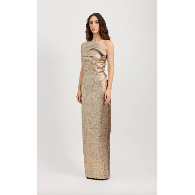 The Tacoma Dress features a sophisticated strapless design with a chic fold-over neckline. Crafted from a stunning metallic fabric, this maxi dress offers a graceful, modern silhouette perfect for special occasions or evening events. It's sleek construction combines effortless style with a touch of shine for a refined, standout look.