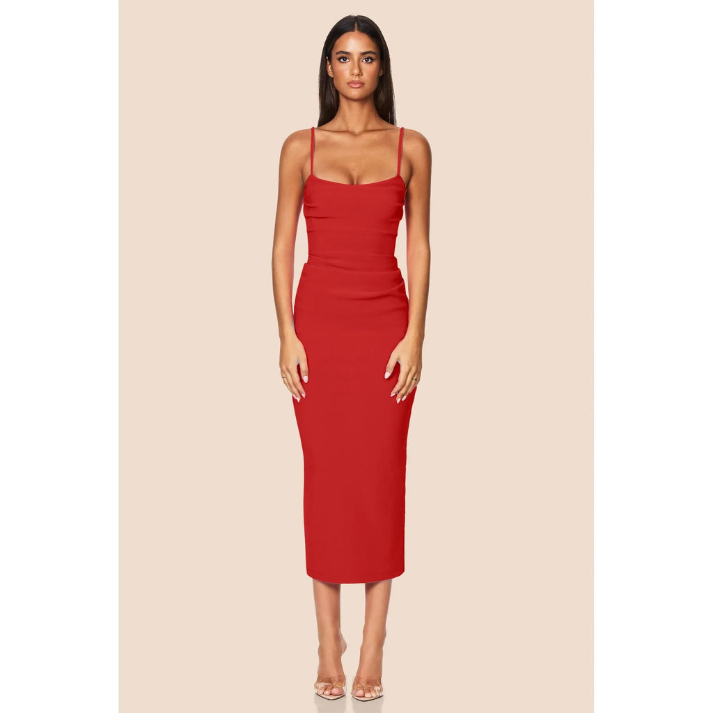 The Tease Midi dress, available in striking wine and red, offers a sleek silhouette that elevates any occasion with bold, confident style.
